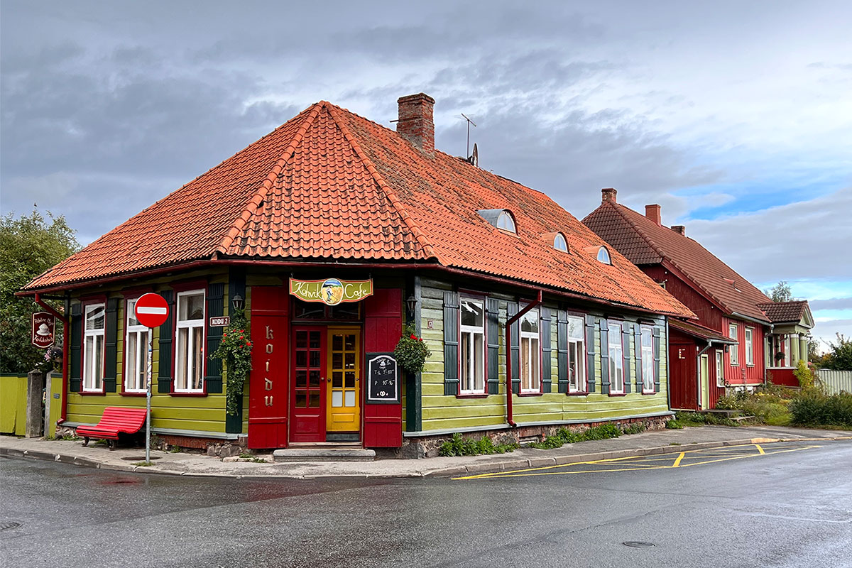 Natürlich gibts so eine Gesangsarena auch in der Kleinstadt Viljandi (etwa 17200 Einwohner, deutsch: Fellin, ehemalige Hansestadt), wo wir zuerst waren. Viljandi hat nämlich die Fakultät für traditionelle Musik der Universität Tartu. Und da haben auch die drei Trad.Attack!-Musiker studiert. Viljandi ist es eine hübsche Stadt mit noch vielen Holzhäusern (die teilweise auf die Renovierung warten), vier Kirchen, viel Grün und einer Ruine der einst mächtigen Deutschorden-Burg Fellin (ab 1224 erbaut, Herrschersitz der deutschen Kreuzritter, Moskoviter, Polen und Schweden). Bemerkenswert waren noch Begegnungen im sehr empfehlenswerten Café Roheline Maja (Grünes Haus), wo sich gleich ein Gast als deutsch-estnischer Übersetzer angeboten hat. Das war ein deutscher Musik-Hochschullehrer in Viljandi und Riga (Christoph Felix Schulz aus Münster, glaub ich, der u.a. auch die Musiker von Trad.Attack! unterrichtet hatte). Eine zweite nette Bekanntschaft war Hela (die Schwester des Café-Besitzers), die lange Zeit in Deutschland gelebt hatte und nun wieder zuhause in Viljandi wohnt und jede Gelegenheit zum Deutsch-Sprechen nutzt. Sie hat uns auch gleich sehr herzlich in ihre kleine Wohnung nebenan eingeladen und ihre Malereien gezeigt. Nach einer Stunde kannten wir fast ihr ganzes bewegtes Leben.