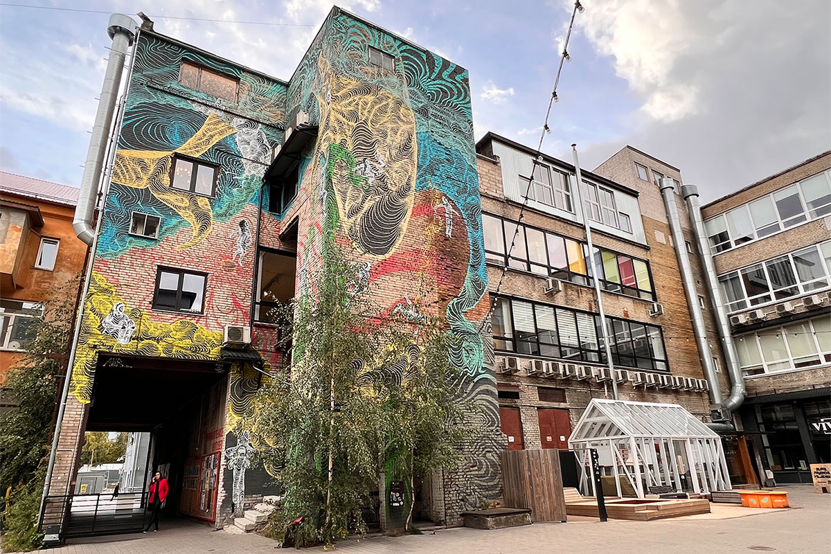 Einen Tagesausflug haben wir nach Tartu gemacht (80 km östlich von Viljandi): mit knapp 100000 Einwohnern die zweitgrößte Stadt nach der Hauptstadt Tallinn. Tartu hat die erste, größte und älteste Universität Estlands mit etwa 14000 Studenten: 1632 unter Gustav II. Adolf von Schweden in der damaligen Hansestadt Dorpat gegründet. Zur Uni gehört noch ein botanischer Garten, der ganz hübsch ist. Tartu wirkt eher gemütlich, aber auch jung und ein bisschen cool: wo gibts sonst noch einen Brunnen mit „Küssenden Studenten“ auf dem Marktplatz (Bildhauer: Mati Karmin, 1998). Das Freizeit-Forschungs-Zentrum AHHAA schien ganz interessant. Wir sind allerdings nur bis zum Riesenstuhl und -tisch gekommen, an dem man sich wie ein Kind fühlen kann: alles ist zu groß und kaum erreichbar. Es gibt viele Studentenkneipen (z.B. Genialistide Klubi: Club der Genies) und den Szenehof Kastani 42 mit Kneipen, Galerien, Clubs und einer Whisky-Manufaktur. Aber der Hammer ist das 2016 fertiggestellte neue Estnische Nationalmuseum: ein 15 m hoher, 70 m breiter, 355 m langer Glaskasten, der in die Landebahn des ehemaligen russischen Bomber-Militärflugplatzes Raadi hineingebaut wurde (Architekten: Dorell.Ghotmeh.Tane, Paris). Das sollte erst woanders, an einem repräsentativeren Platz gebaut werden, aber die Architekten wollten es unbedingt so, als Zeichen der Aufarbeitung des estnischen Traumas der russischen Besetzung und der Wiederaneignung der estnischen Identität.
