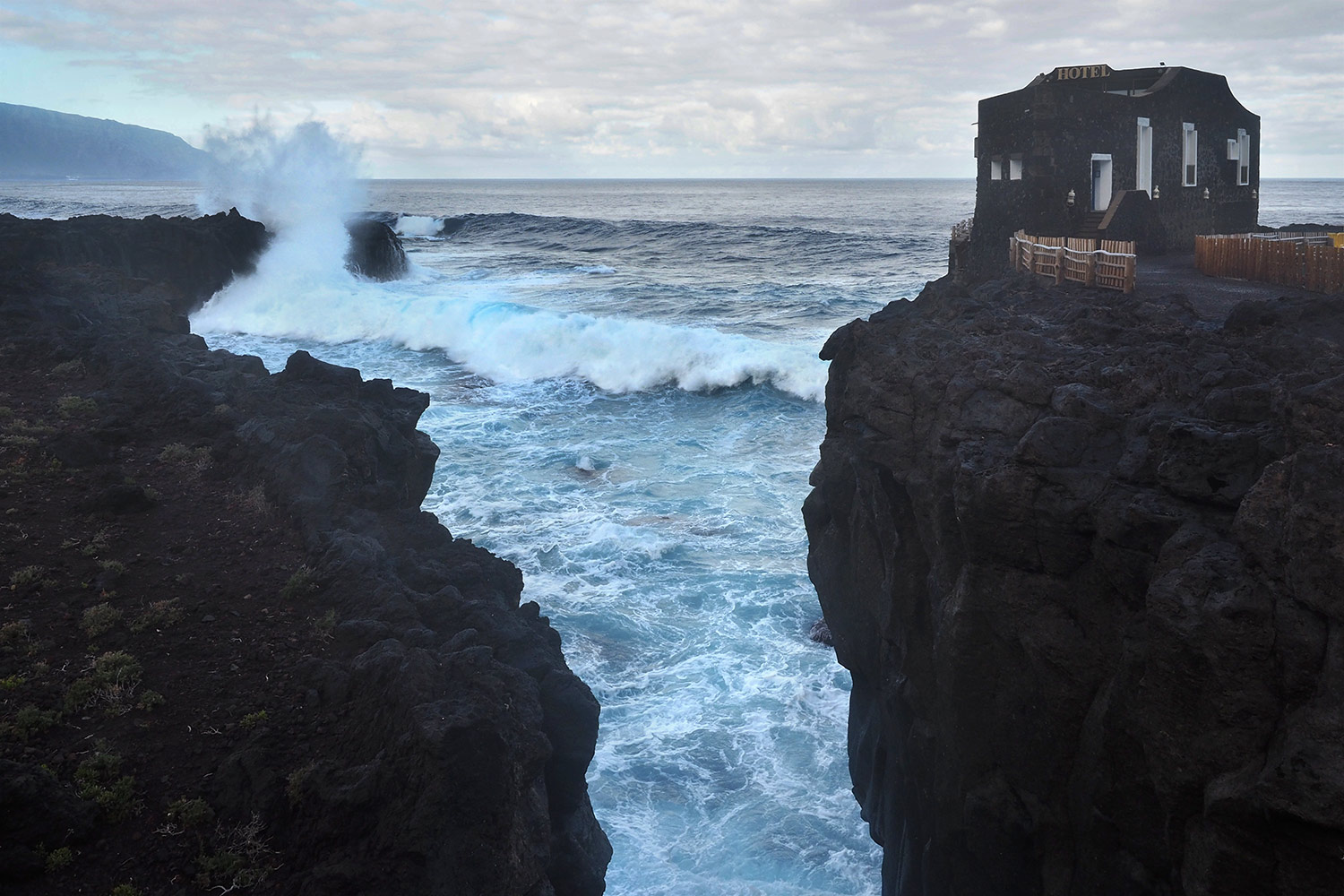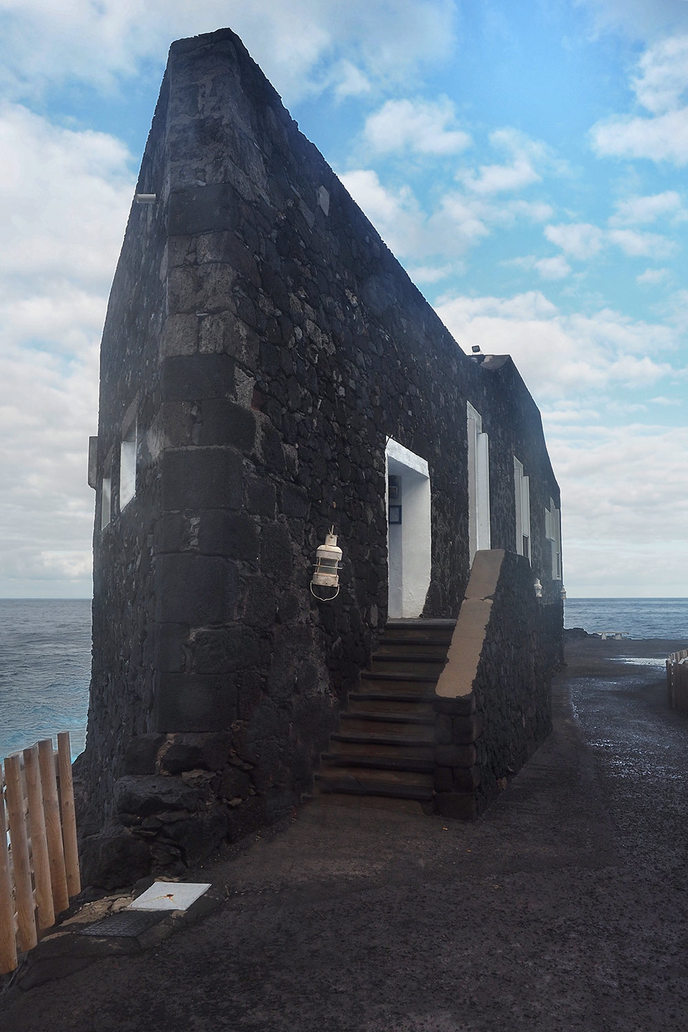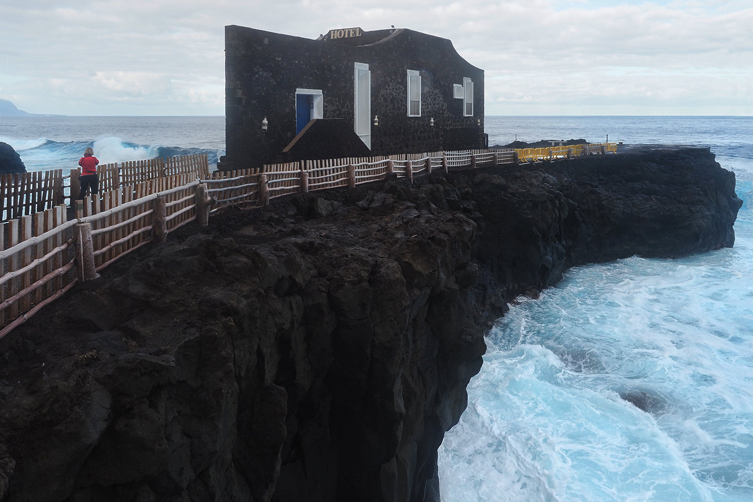 Das Erste und das Letzte, was man vom Golfo-Tal sieht, wenn man die Straßenroute durch den Túnel de los Roquillos nimmt, ist Las Puntas. Zu Anfang unseres Urlaubs auf El Hierro waren wir im Supermercado Las Puntas zur „Erstausstattung“. Und zum Schluss haben wir noch ein paar Fotos vom Hotel Puntagrande an den Klippen gemacht. Las Puntas ist der einzige „größere“ Ort direkt an der Küste von El Golfo ganz im Nordosten gleich hinter dem Tunnelausgang (abgesehen von Pozo de la Salud, das zu Sabinosa gehört und nur aus dem Kurhotel und ein paar Häusern besteht). Die Lavasteilküste bei Las Puntas unterhalb der rund 1000 m hohen Felswand Risco de Tavetai ist von rauen Lavaformationen geprägt: Buchten, Tunnel, Höhlen, Felsbrücken und ins Meer ragende Klippen (Puntas). Ziemlich bekannt ist das laut Guiness-Buch „kleinste Hotel der Welt“ el Hotelito, das Hotel Puntagrande: 4 Zimmer in einem kleinen Lavasteinhaus, spektakulär auf dem etwa 150 m langen Kap Punta Grande im Meer gelegen. Das Gebäude wurde ursprünglich 1830 als Packhaus des kleinen Bootsanlegers (Hafen wäre übertrieben) auf der ins Meer ragenden Lavaklippe (Ladekai und -kran sind noch da) gebaut als die Landverbindungen mühselig waren und alle Waren des Golfo-Tales (auch das Heilwasser vom Pozo de la Salud) mit Schiffen transportiert wurden. Nach dem Straßenbau auf El Hierro wurde der Schiffsanleger bedeutungslos, seit 1969 war es ein Restaurant, verfiel aber immer mehr. Ab 1975 wurde das Haus als Museums-Hotel restauriert und mit maritimen Sammlerstücken ausgestattet, seit 1979 führte es die Italienerin Gemma Chinosi, 1984 wurde es im Guiness-Buch der Rekorde als kleinstes Hotel der Welt geführt. Seit 2018 wird das Hotel von dem italienischen Einwandererpaar David und Paula Nahmias betrieben. Von der Inselregierung El Hierros wurde das Hotel Puntagrande 2019 als „Bien de Interés Cultural“ (BIC) eingestuft, ein kulturelles Baudenkmal. Ab 200 € (pro Nacht, nicht Woche) ist der Spaß, im kleinsten Hotel zu wohnen, nicht ganz billig, aber es gibt ja auch noch einige andere Unterkünfte in Las Puntas, außerdem das architektonisch interessante Freibad Cascadas del Mar, ein paar Restaurants, die Quesadillas-Bäckerei Abuela und den Supermercado Las Puntas. Das war unsere erste Anlaufstelle als wir ins Golfo-Tal gekommen sind: da gabs sogar noch den originalen Inselwein (der sonst überall ausverkauft war), die zum Probieren angebotenen Quesadillas de la Abuela fand ich zur Belustigung der Verkäuferin ziemlich gewöhnungsbedürftig (käsig eben) und die junge Verkäuferin klärte uns auf, dass die El-Hierro-Touristen von den Einheimischen Flamingos genannt werden. Seitdem fragen wir uns, was Touristen mit so rosa Vögeln gemein haben.
