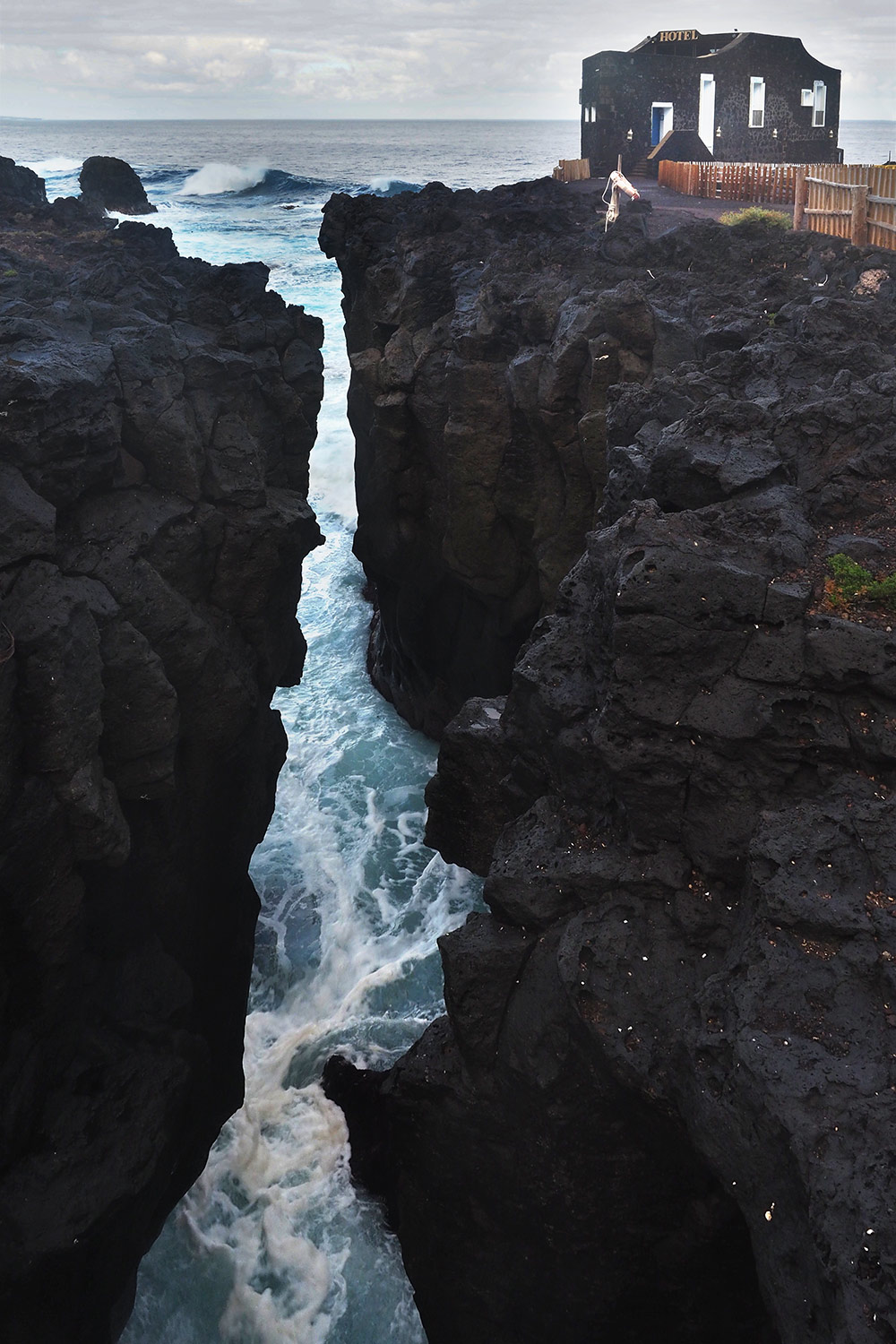 Ziemlich in der Mitte der Golfo-Bucht an der Bahía de los Pozos (Brunnen-Bucht) liegt 1,5 km vom Dorf Los Llanillos das Bad Charco Azul (Blaue Pfütze). An der rauen Steilküste hat eine Lavazunge ein Gewirr von kleinen Klippen, Felsvorsprüngen, Bögen und Buchten hinterlassen, die den Uferbereich vor allzu starker Brandung schützen. Ein natürlicher Pool kann unter einem Felsbogen erreicht werden, ein anderer wurde durch kleine Wellenschutzmauern abgetrennt. In die urtümliche Lavalandschaft wurden noch ein paar Holzpodeste als Liegeflächen eingebaut (Frittenbude gibt’s nicht und Klo hab ich nicht gesehn… das Meer spült ja sowieso ständig durch). Von einem kleinen Parkplatz auf der Klippe führt ein vielleicht 200 m langer Fußweg an den Geröllstrand. Man hat Aussicht entlang der ganzen Golfo-Küste von der Punta de la Dehesa im Westen bis zur Punta de Arelmo mit den Roques de Salmor im Osten (jeweils etwa 8 km entfernt). An den Klippen, Höhlen und Schluchten gibt’s interessante Lavaformationen (z.B. schöne Stricklava). Nur das Badewetter war mit etwa 3 m hohen Wellen gerade ungünstig.