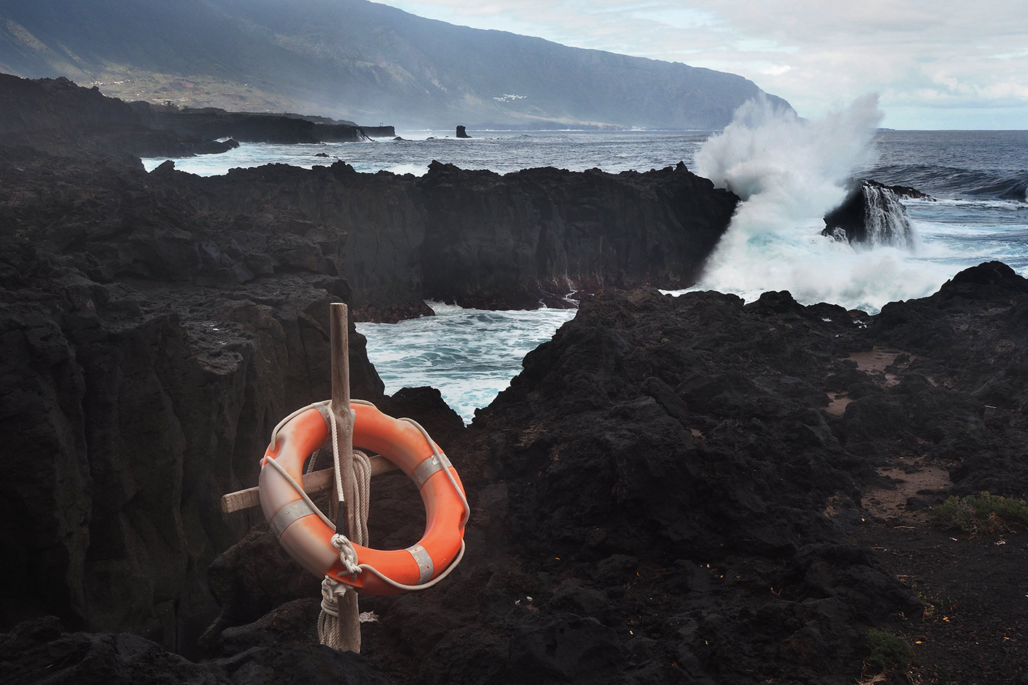 Inzwischen versucht man, die nicht sehr haltbaren Häuser aufwändig zu bewahren, manchmal wird mit Beton und Blech etwas nachgeholfen (und einige reine Betonbauten, die sich mit Vulkansteinplatten tarnen, gibts auch). Im Laufe der Zeit hat sich Pozo de las Calcosas zum Sommerferien- und Badeort von Mocanal entwickelt, weil die etwas geschützt zwischen zwei Lavazungen gelegene Bucht und ein flacherer mit Brandungsschutzmauern eingefasster Pool als Meerbad geeignet sind. Im Herbst und Winter ist der einsame Ort (außer den paar Touristen) meist völlig verlassen. Nur Neptun, eine riesige Skulptur aus Sperrmüll, Blech, Stoff, Zement und Farbe von Rubén Armiche (ein Pop-Art-Künstler von Gran Canaria) wacht seit 2007 über die Bucht. An einem stürmischen Tag wie bei unserem Besuch glich die sonst ruhige Badebucht aber eher einem überschäumenden Whirlpool, über den meterhohe Wellenbrecher rollten.